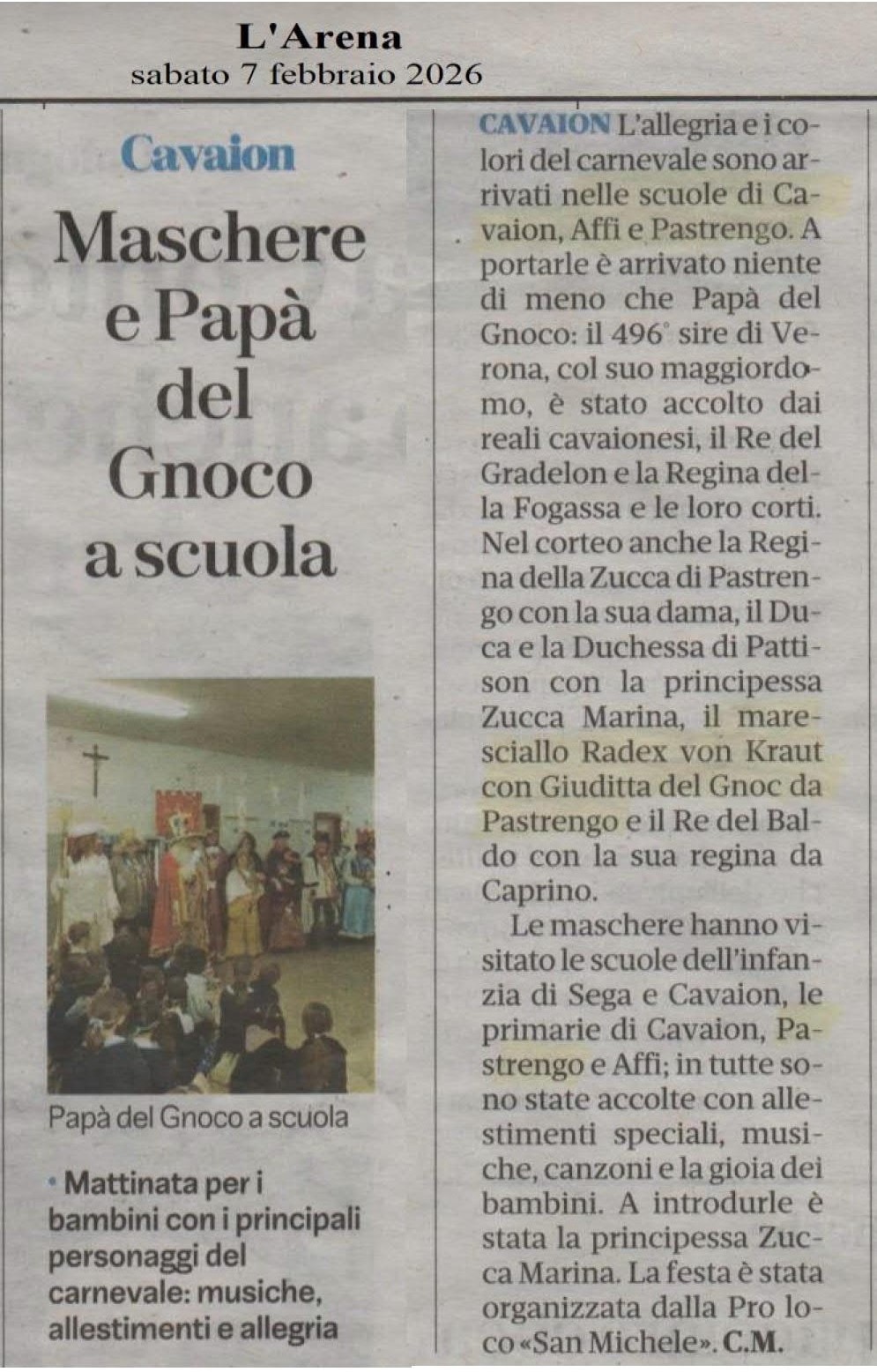 Maschere e Papà del Gnoco a scuola - da L'Arena sabato 7 febbraio 2026